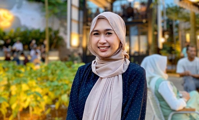 Selain tampil dengan seragam pramugari yang membuatnya tampak menawan, ia pun sering membagikan kegiatan sehari-harinya dengan menggunakan hijab.